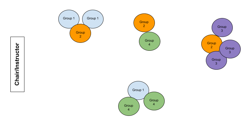 Open-Floor Negotiations - In contrast with the ordered meeting above, this one is much more chaotic. In this one, students can move around the room and talk with each other in focused negotiations. The first few minutes will often be fairly limited so increasing the tension or using other tools of inducing action may be necessary. Groups do not need to stay together and can engage in multiple negotiations simultaneously. For example, in the depiction below: Group 1 has divided between a meeting with Group 4 and Group 2. The members of Group 2 have spread all their members to different groups. In contrast, Group 3 has chosen to stay together and engage in negotiations as a unified group. All can be useful.